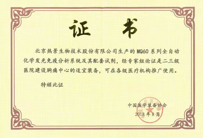 早在2018年,MQ60系列全自動(dòng)化學(xué)發(fā)光免疫分析系統(tǒng)及其配套試劑通過中國(guó)醫(yī)學(xué)裝備協(xié)會(huì)組織國(guó)內(nèi)檢驗(yàn)、心內(nèi)和急診等領(lǐng)域知名專家技術(shù)論證,一致認(rèn)為該設(shè)備滿足急診對(duì)高質(zhì)量檢測(cè)結(jié)果的要求,性能穩(wěn)定可靠,操作簡(jiǎn)單快速,符合質(zhì)控要求,不依賴其它設(shè)備或繁瑣前處理,可對(duì)各類樣品進(jìn)行檢測(cè),滿足二三級(jí)醫(yī)院建設(shè)胸痛中心的要求,適合各級(jí)醫(yī)療機(jī)構(gòu)推廣應(yīng)用。