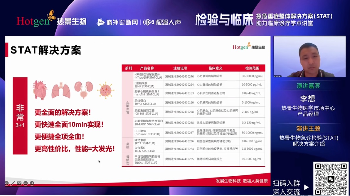 熱景生物醫(yī)學(xué)市場(chǎng)中心李想經(jīng)理根據(jù)臨床調(diào)研結(jié)果以及在急危重癥多樣化患者,分享熱景生物完整的急危重癥整體解決方案(STAT),并且分別闡述了不同場(chǎng)景匹配的解決方案,實(shí)現(xiàn)全血單人份10min準(zhǔn)確報(bào)告出具,目前涵蓋心腦血管、炎癥以及腎損傷相關(guān)指標(biāo)的全景解決方案,非常適用于胸痛中心、急診、ICU等臨床科室開展。