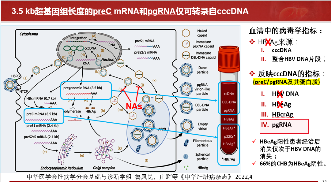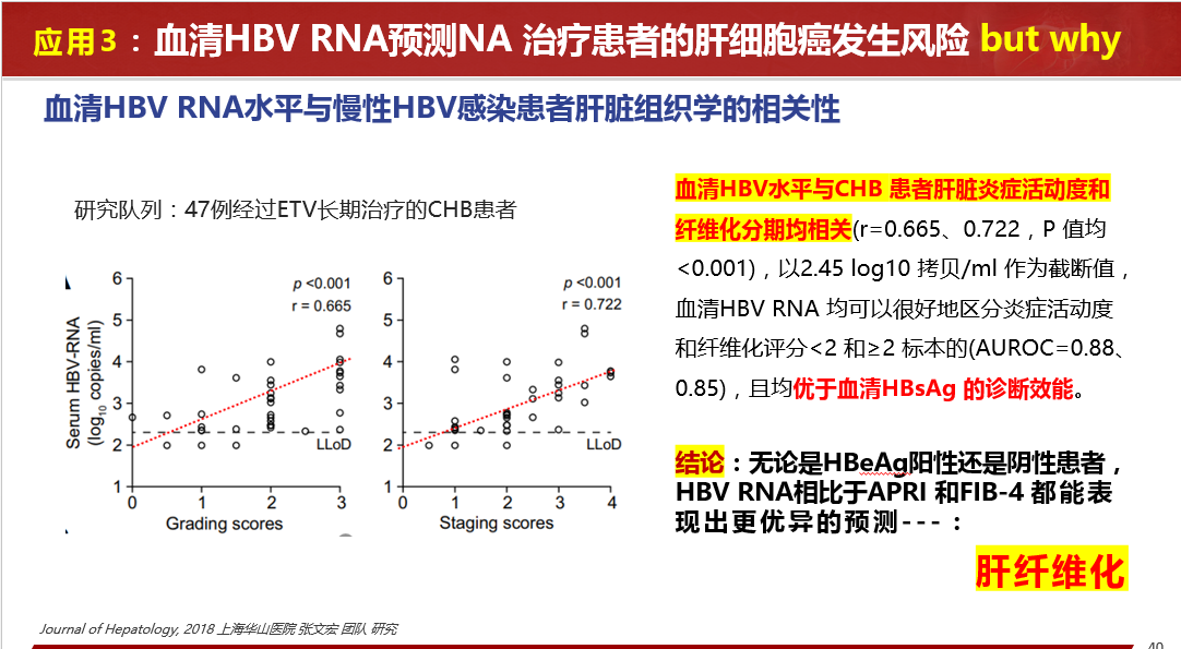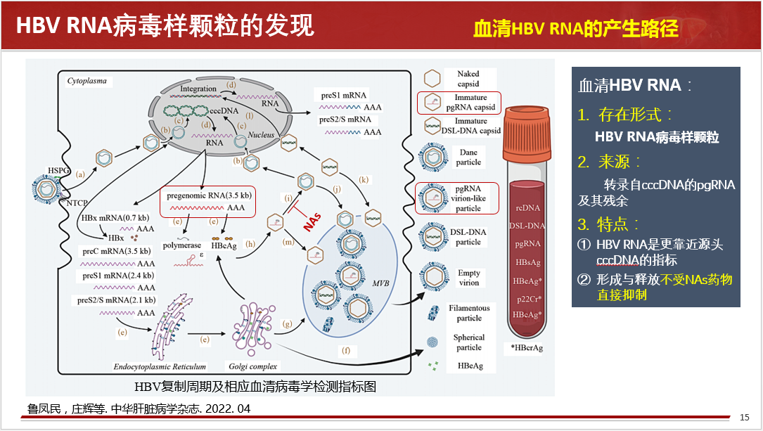 關(guān)于HBV RBA病毒樣顆粒的發(fā)現(xiàn)、血清HBV RNA的產(chǎn)生路徑、存在形式、來源和特點(diǎn)等做了詳細(xì)闡述,同時分享國內(nèi)肝病領(lǐng)域張文宏研究團(tuán)隊(duì)等工作成果,血清HBV RNA水平反映肝內(nèi)cccDNA的轉(zhuǎn)錄活性,血清 HBV pgRNA,是NA治療下HBV DNA < LLOQ后,能夠反映患者肝組織內(nèi)是否有cccDNA活躍轉(zhuǎn)錄的唯一指標(biāo)。