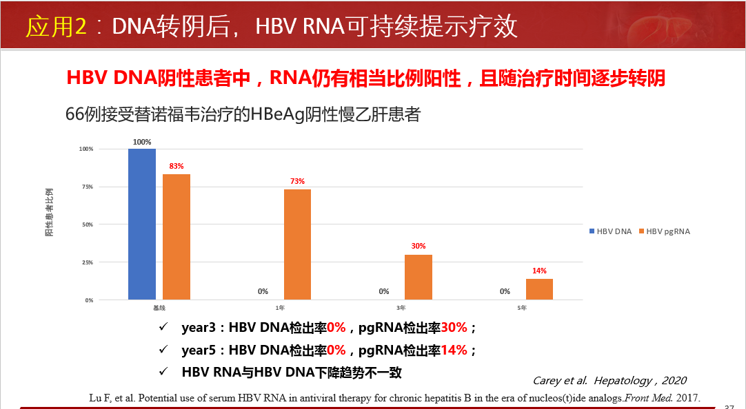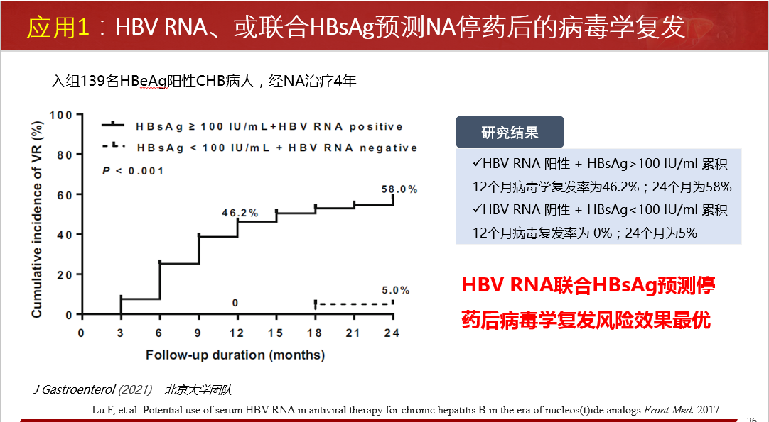 臨床應(yīng)用方面:指導(dǎo)安全停藥;NA治療下患者血清HBV RNA檢測陽性預(yù)示更高的HCC發(fā)生風(fēng)險;NA治療下患者血清HBV RNA檢測陽性,提示病毒cccDNA仍在有效轉(zhuǎn)錄表達(dá)病毒蛋白、組裝子代病毒顆粒樣pgRNA病毒顆粒。
