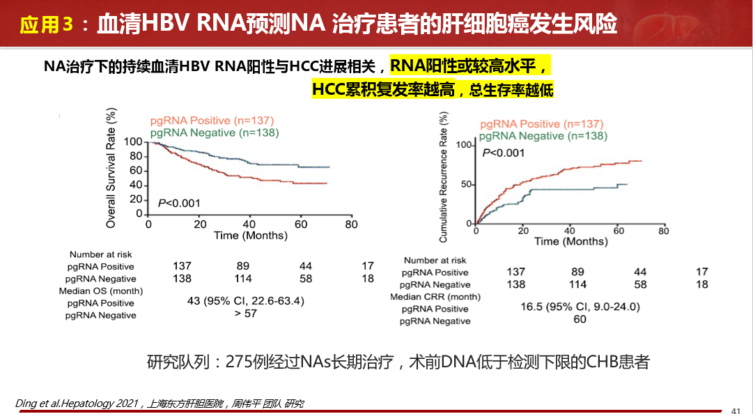 ★ NA治療下的持續(xù)血清HBV RNA陽性與HCC進(jìn)展相關(guān),RNA陽性或較高水平,HCC累積復(fù)發(fā)率越高,總生存率越低。