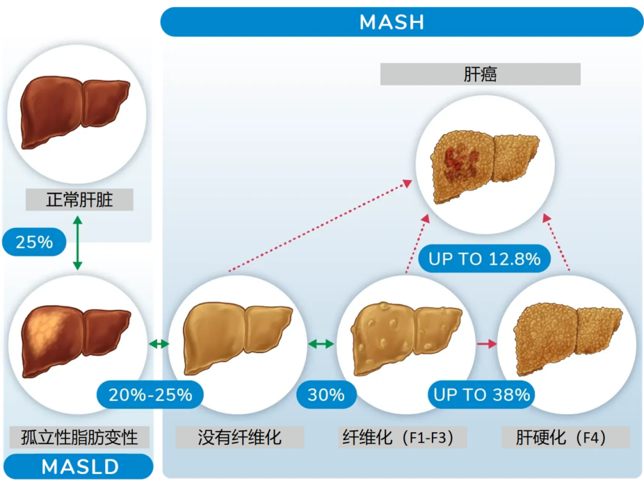 MASLD疾病譜包括單純性脂肪肝(MAFL)、脂肪性肝炎(MASH)及其相關纖維化和肝硬化。隨著肥胖和2型糖尿病(T2DM)的流行,全球MASLD患病率和發(fā)病率不斷增高。據(jù)報道,全球MASLD的發(fā)病率約20-35%,其中約10-30%的患者患有MASH。