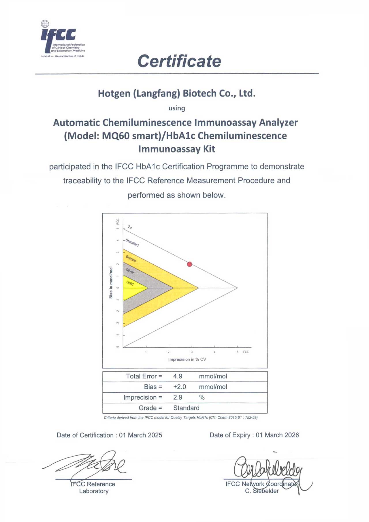 近日,熱景生物單人份化學(xué)發(fā)光免疫分析儀MQ60 Smart 檢測HbA1c獲得國際臨床化學(xué)與實驗室醫(yī)學(xué)聯(lián)合會(IFCC)的認(rèn)證,確保了其檢測結(jié)果的標(biāo)準(zhǔn)化、規(guī)范化和國際化水平。同時意味著MQ60 Smart 檢測HbA1c的檢測結(jié)果具有國際認(rèn)可的質(zhì)量和可靠性。