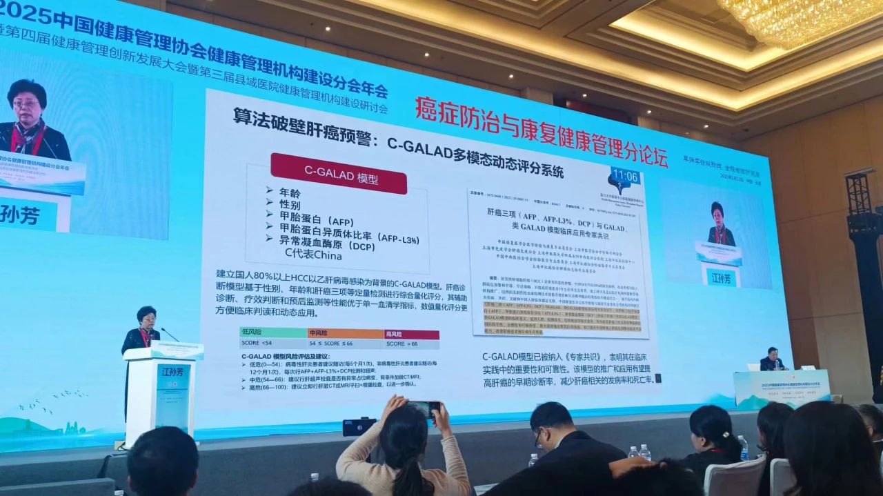在《癌癥防治與康復(fù)健康管理》專項論壇中,復(fù)旦大學(xué)附屬中山醫(yī)院江孫芳主任受邀發(fā)表專題報告《健康管理中心-社區(qū)聯(lián)動 助力肝癌早篩》,從臨床實踐與科研結(jié)合的角度,系統(tǒng)闡述了C-GALAD模型在肝癌早期篩查中的創(chuàng)新應(yīng)用價值。