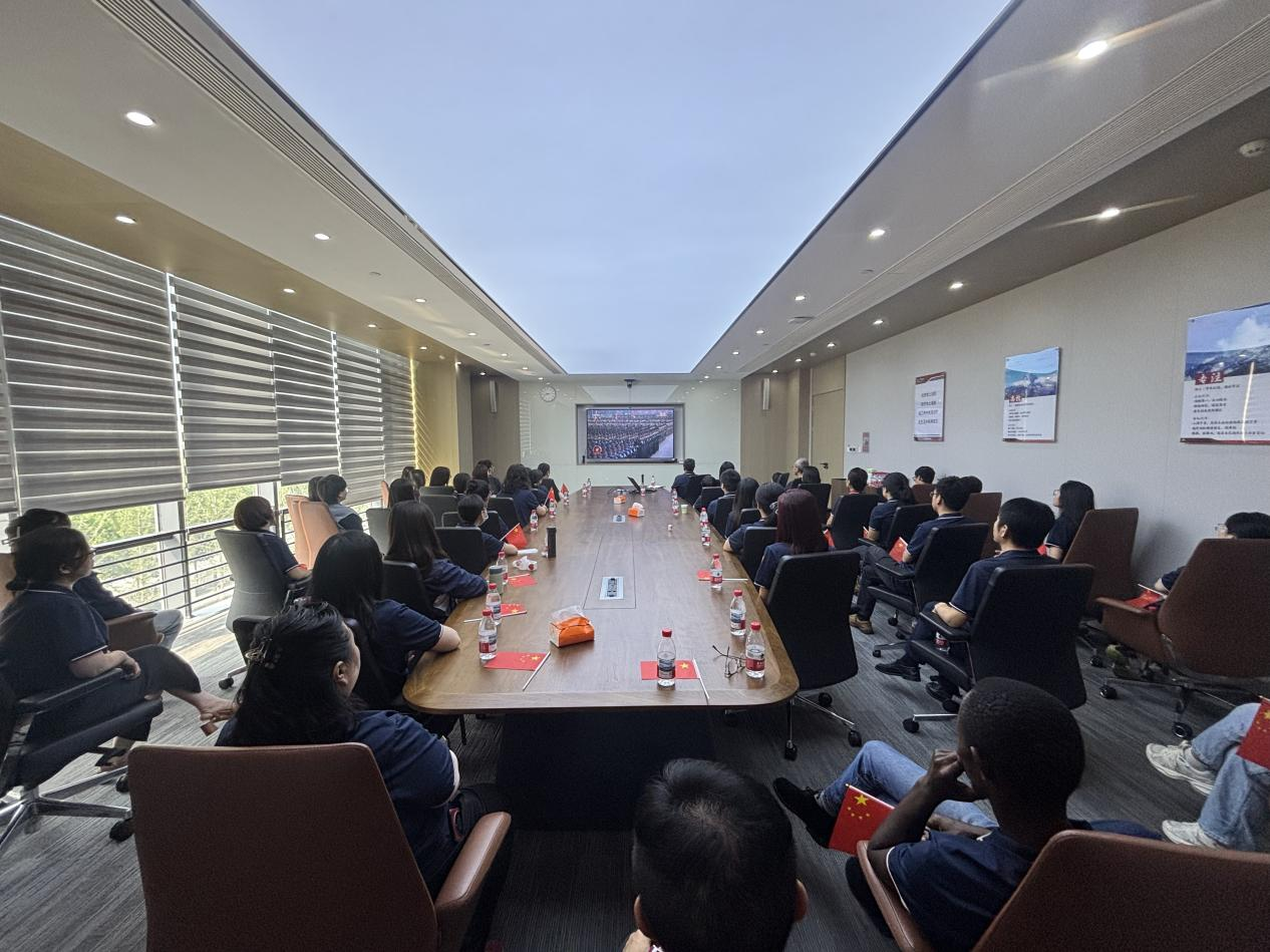 直播觀看過程中,公司員工全神貫注,當(dāng)受閱官兵邁著堅(jiān)定整齊的步伐、颯爽英姿震撼全場,當(dāng)國產(chǎn)現(xiàn)役主戰(zhàn)裝備相繼亮相彰顯國家強(qiáng)盛國力,當(dāng)承載功勛榮譽(yù)的戰(zhàn)旗方隊(duì)與呼嘯而過的空中梯隊(duì)依次登場時,在場人員無不心潮澎湃,無不為之贊嘆,響起持久而熱烈的掌聲,以表達(dá)對革命先輩的崇高敬意。